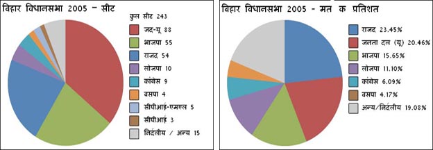 अगर वर्ष 2005 क फरवरी क चुनाव स नवंबर क तुलना कैल जाए, त राजग क मत मे महज 2 फीसदी क इजाफा भेल अछि आओर हुनका 38 फीसदी मत भेटल, हालांकि सीटवार 20 फीसदी क जबरदस्त फायदा भेल आ 175 विधानसभा क्षेत्र मे बढ़त हासिल भेल। एहन एहि कारण स भेल किया कि राजद आ ओकर सहयोगी क मत मे कमी आईल आ ओ 31 स घटिकए 26 फीसदी पर आबि गेल। जाहिर अछि दूनू गठबंधन क बीच कुल प्राप्त मत क अंतर 12 फीसदी तक जा पहुंचल छल।