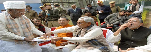 मकर संक्रांतिक अवसर पर राजग कार्यालय मे आयोजित तिलकुट भोज मे शामिल मुख्यमंत्री नीतीश कुमार
